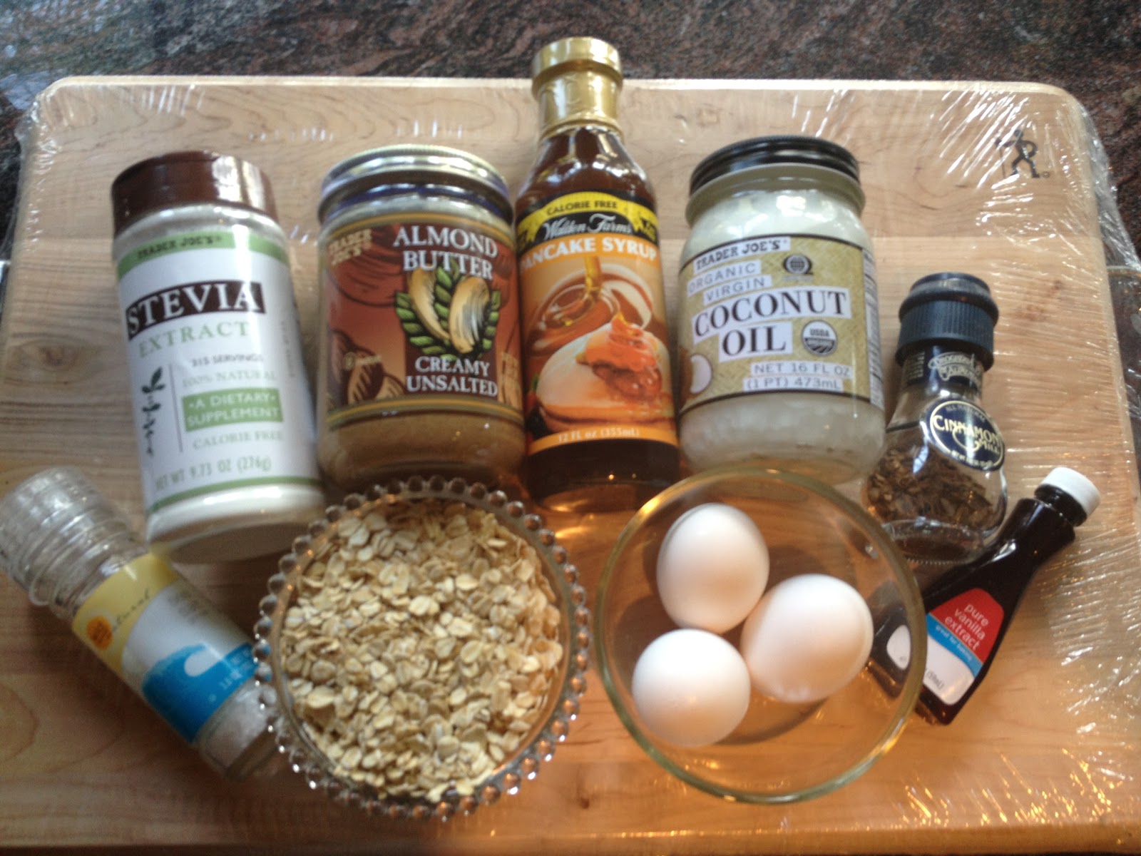 - Mix Almond Butter, Coconut oil (heat almond butter and coconut oil in the microwave for 30 seconds prior for easy use), Stevia, Egg Whites, Vanilla Extract and Pancake Syrup